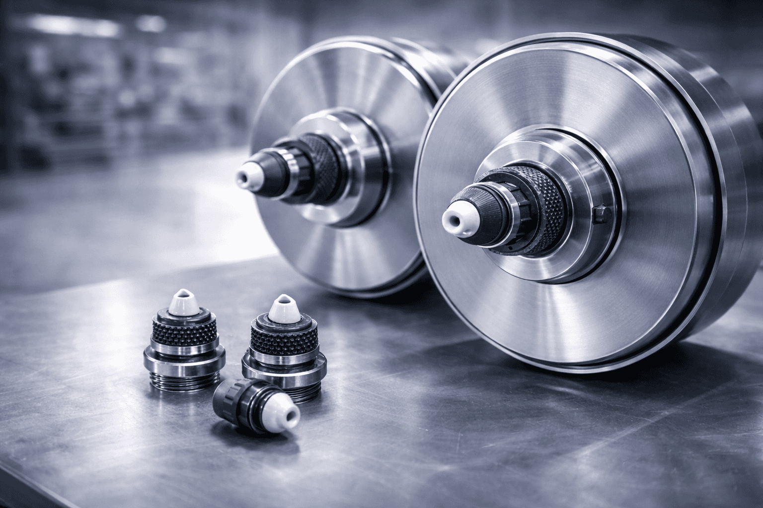 Titan-Rotationskomponenten mit modularem SSiC-Verschleißschutz. Einzeln tauschbare Düsen für minimale Stillstandzeiten.