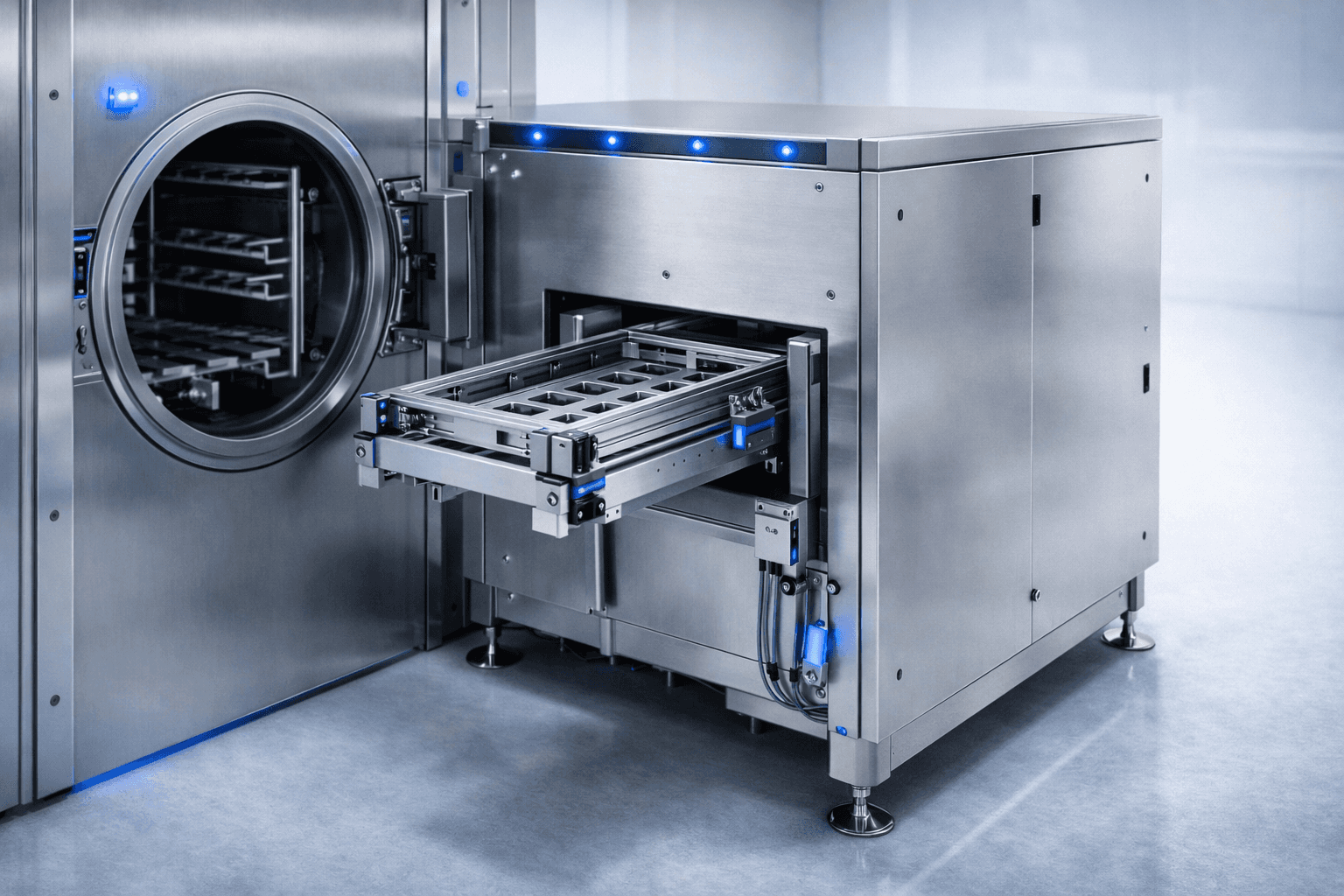 Automatisierte Be- und Entladesysteme am Point of Sterilization – ohne Eingriff in bestehende Validierungen.